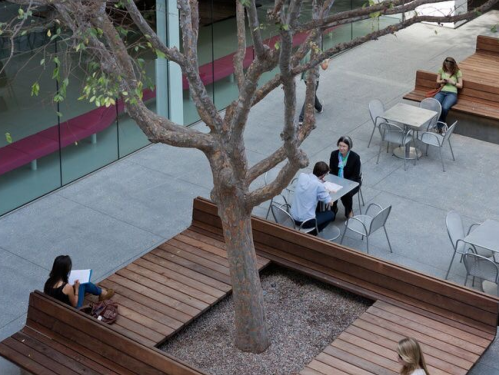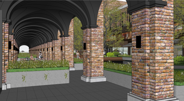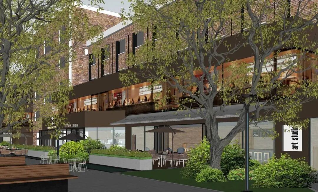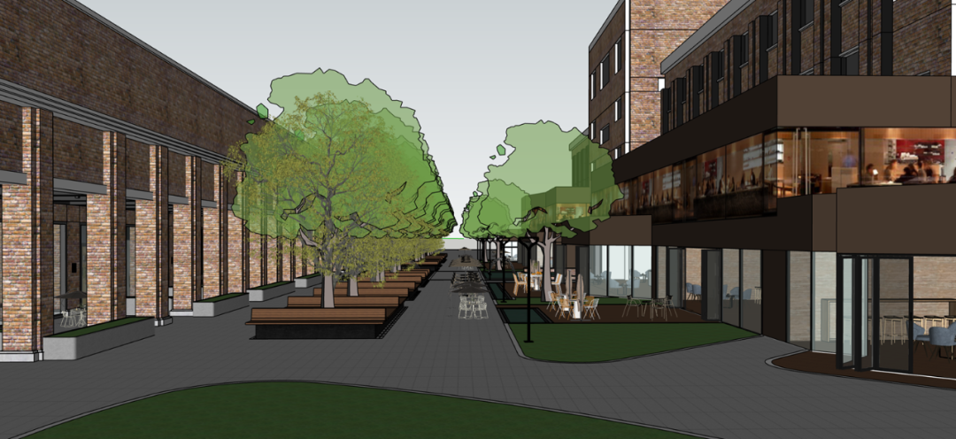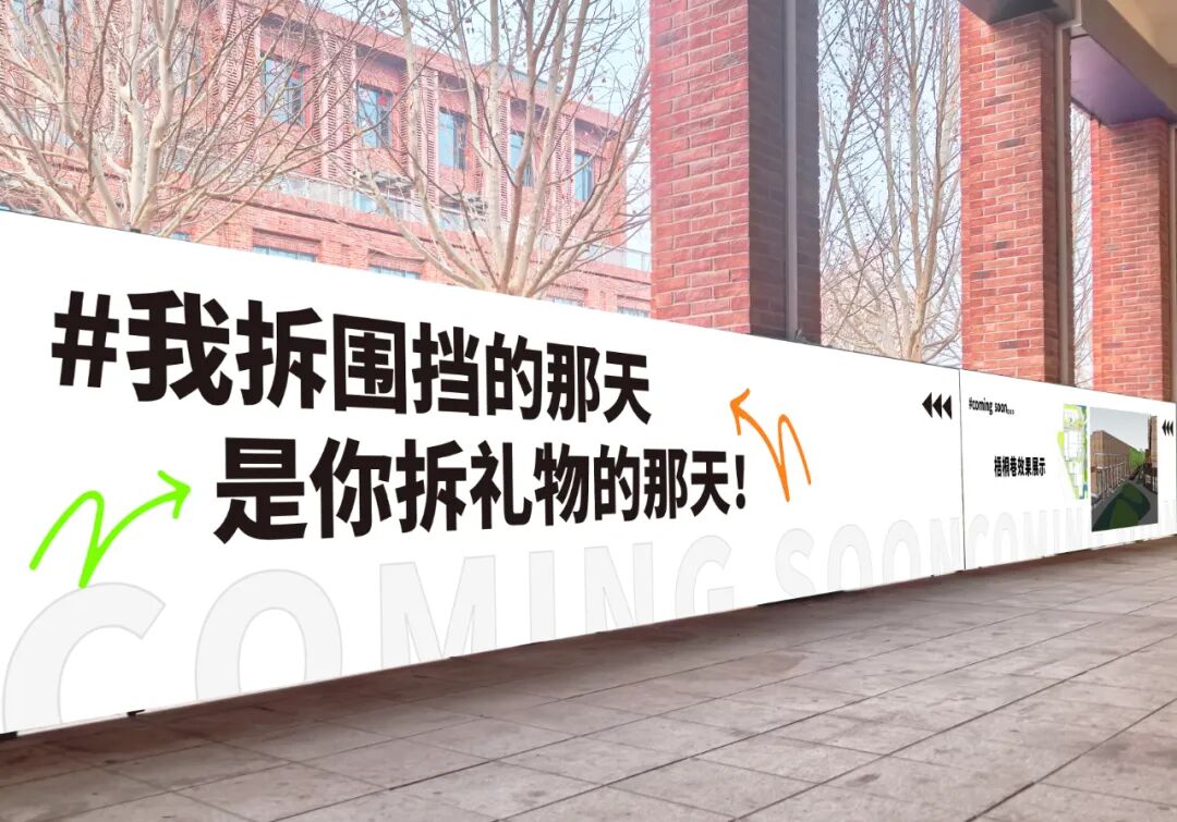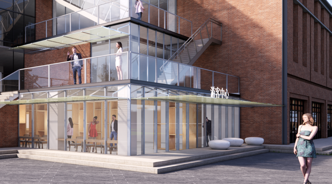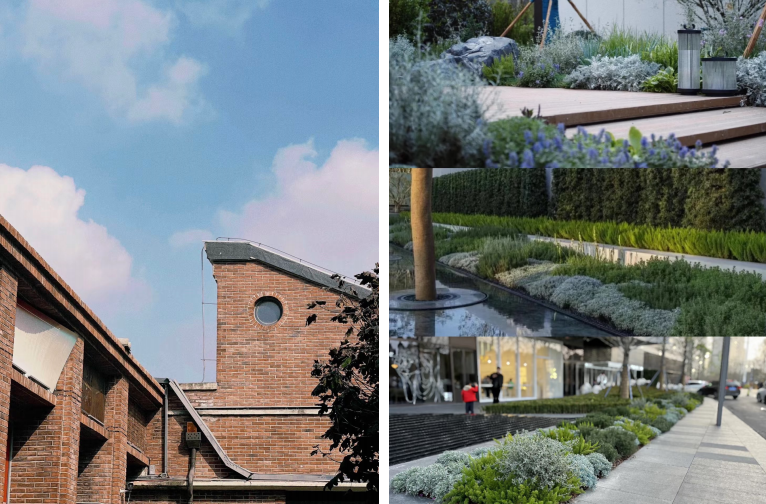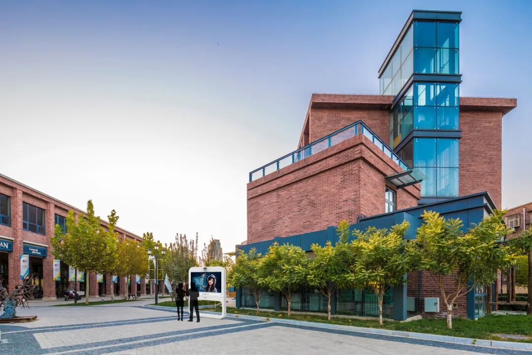 与园区建筑本身的红砖对比,冷暖色调相互映衬,营造出和谐且富有韵律的视觉感受。