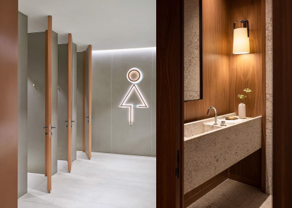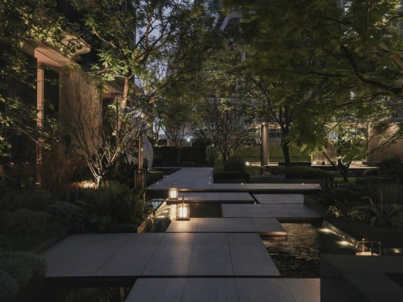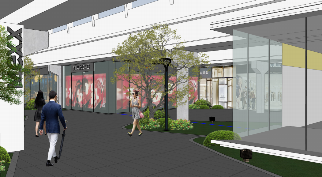 将建筑外檐、标识、景观铺装、水景、照明、座椅等装置进行系统设计,在商业间打造自然、松弛、温暖的“城市会客厅”。